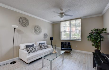 LIVING ROOM: QUEEN SOFA BED, LOVE-SEAT, 2 END TABLES, COFFEE TABLE, FLAT SCREEN TV